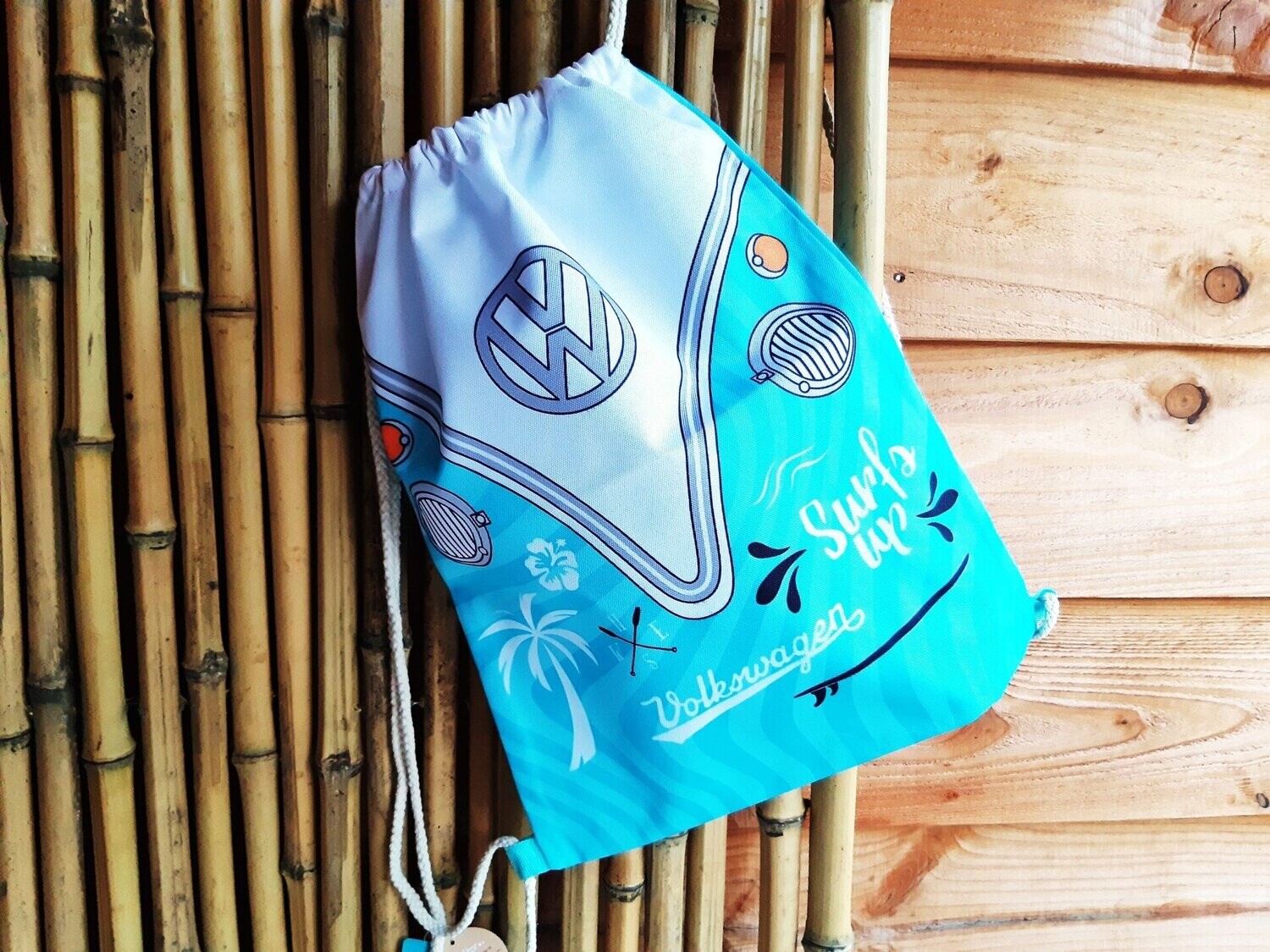 Handige rugtas met trekkoord met VW T1 camper bus surf adventure opdruk. Een handige, duurzame en lichtgewicht rugtas. Gemaakt van sterk polyester.